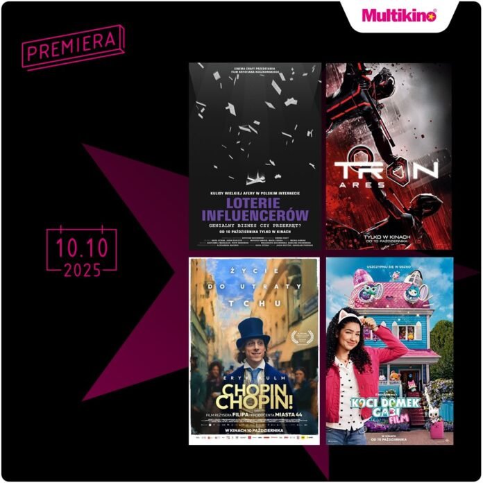 Od 10 października na widzów w kinach sieci Multikino będą czekały aż cztery premierowe propozycje – „TRON: Ares” z Jaredem Leto, „Chopin, Chopin!” z Erykiem Kulmem, dokument „Loterie influencerów” oraz produkcja familijna „Koci domek Gabi”. Szczegółowy repertuar jest dostępny na stronie www.multikino.pl.