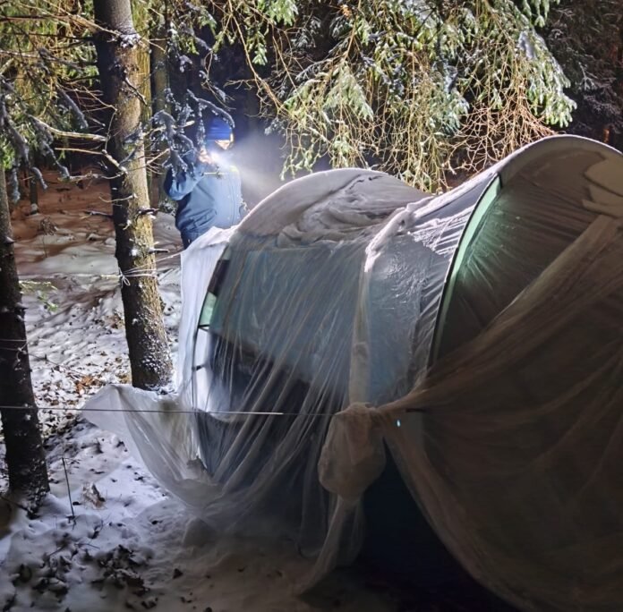 Bezdomni w lesie w Tychach rozbili koczowisko. Mieszkają tam od lat, gotują sobie, dogląda ich Straż Miejska. Municypalni trzy razy dziennie patrolują miejsca, w których przebywają bezdomni na terenie miasta – czy to pod mostem na al. Bielskiej, czy koczowisku w lesie przy ulicy Lokalnej. Strażnicy mają ze sobą koce i często ciepłą herbatę, ale rzadko kiedy udaje im się namówić kogoś do skorzystania z noclegowni.