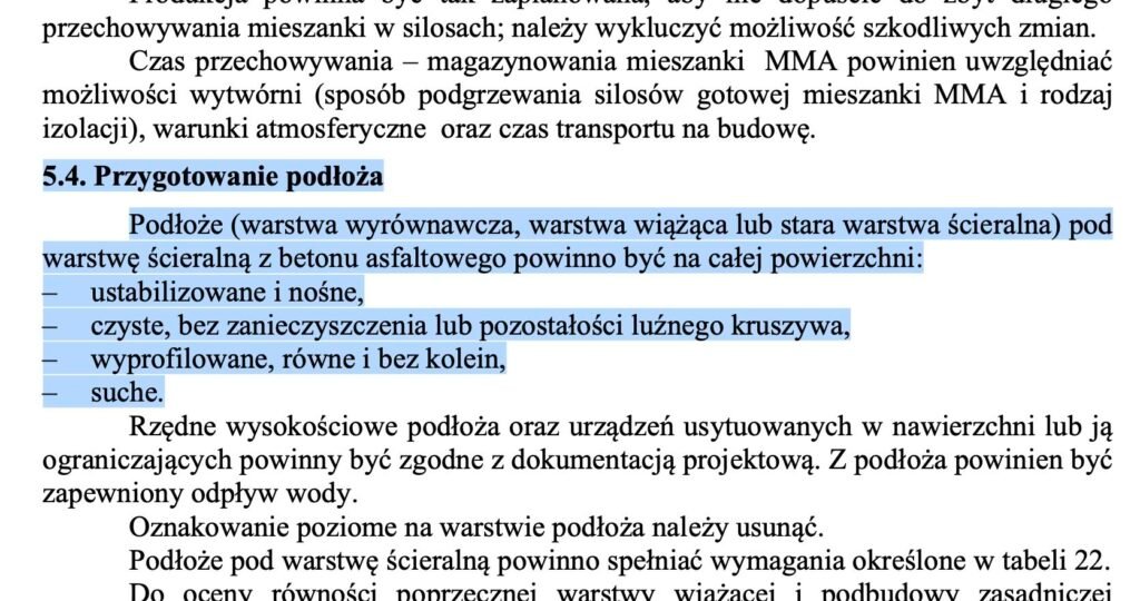 „Podłoże (warstwa wyrównawcza, warstwa wiążąca lub stara warstwa ścieralna) pod warstwę ścieralną z betonu asfaltowego powinno być na całej powierzchni: