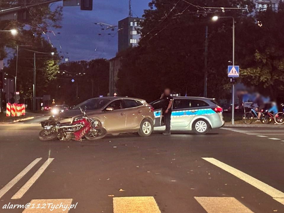 Czołowe zderzenie samochodu z motocyklem w Tychach. Dzisiaj przed godziną 20.00 doszło do wypadku na skrzyżowaniu ulic Edukacji i Grota-Roweckiego. Samochód osobowy zderzył się z motocyklem.