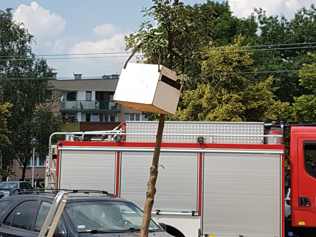 Na drzewie, gdzie pojawiły się pszczoły zawieszono specjalny pojemnik, do którego owady są wabione.