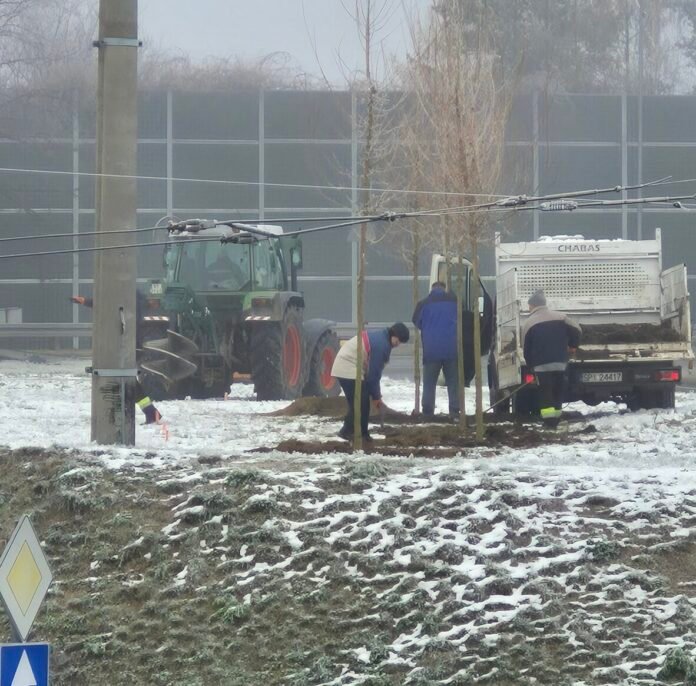 Mróz i śnieg, a w Tychach sadzili drzewa. Miasto tłumaczy sytuację. Chodzi o drzewa sadzone przy wyjeździe z ulicy Sikorskiego na DK1.