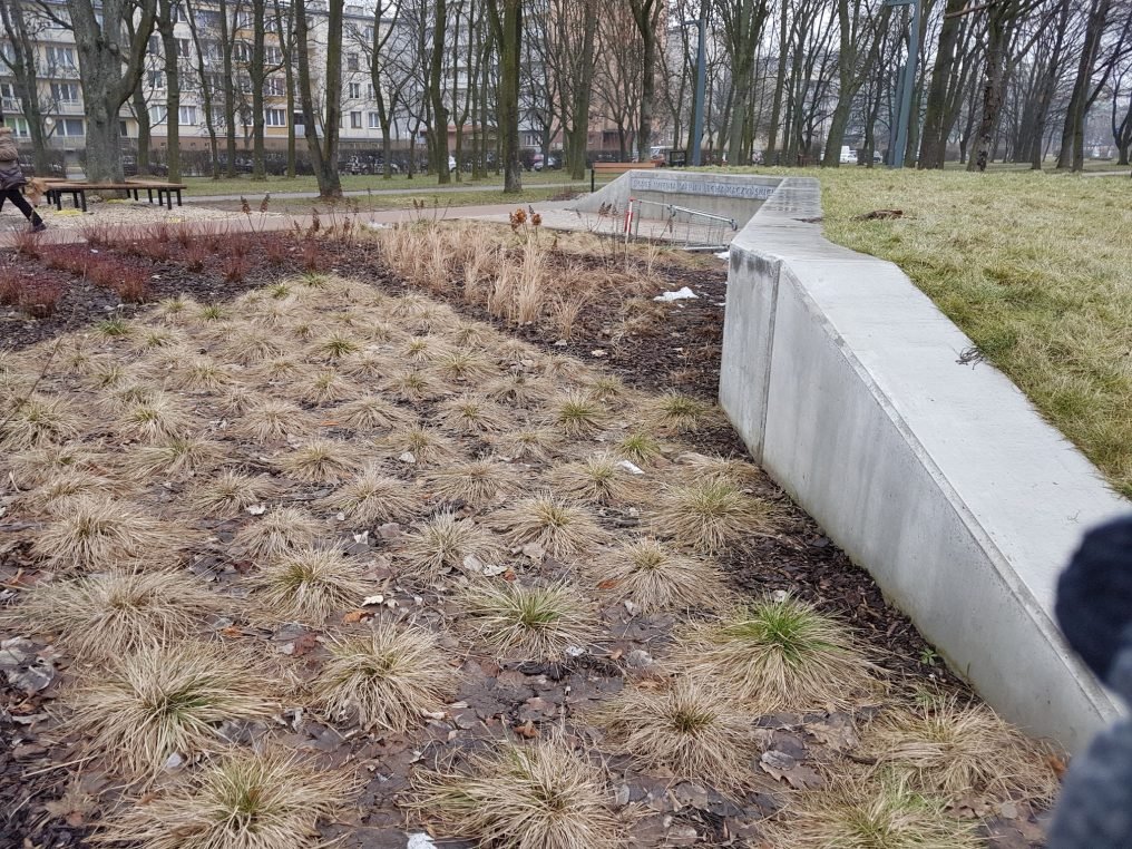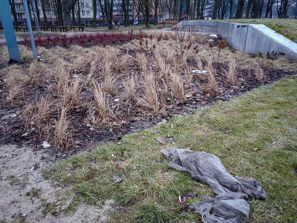 Niestety, pomimo poprawy infrastruktury w tym rejonie, charakter tego miejsce specjalnie raczej się nie zmienił. Ciągle widać w rejonie nowo utworzonego deptaka śmieci i butelki po alkoholu. Dzisiaj zauważyliśmy tam wózek z marketu. Wywrócony leżał na terenie zielonym przy skwerze.