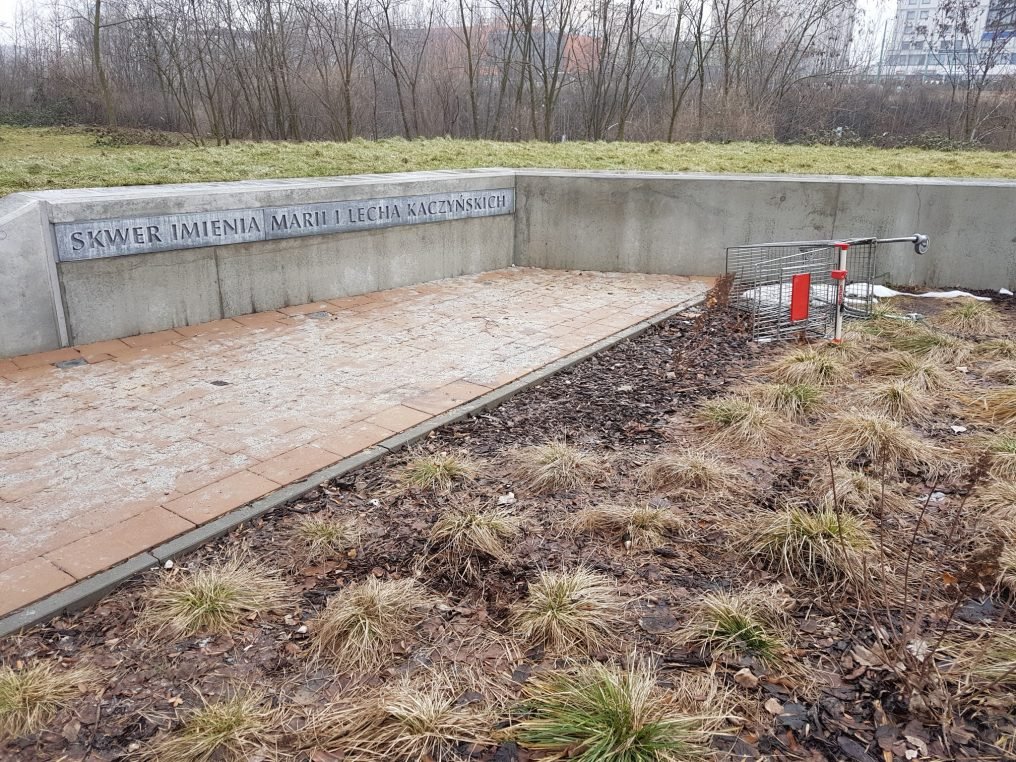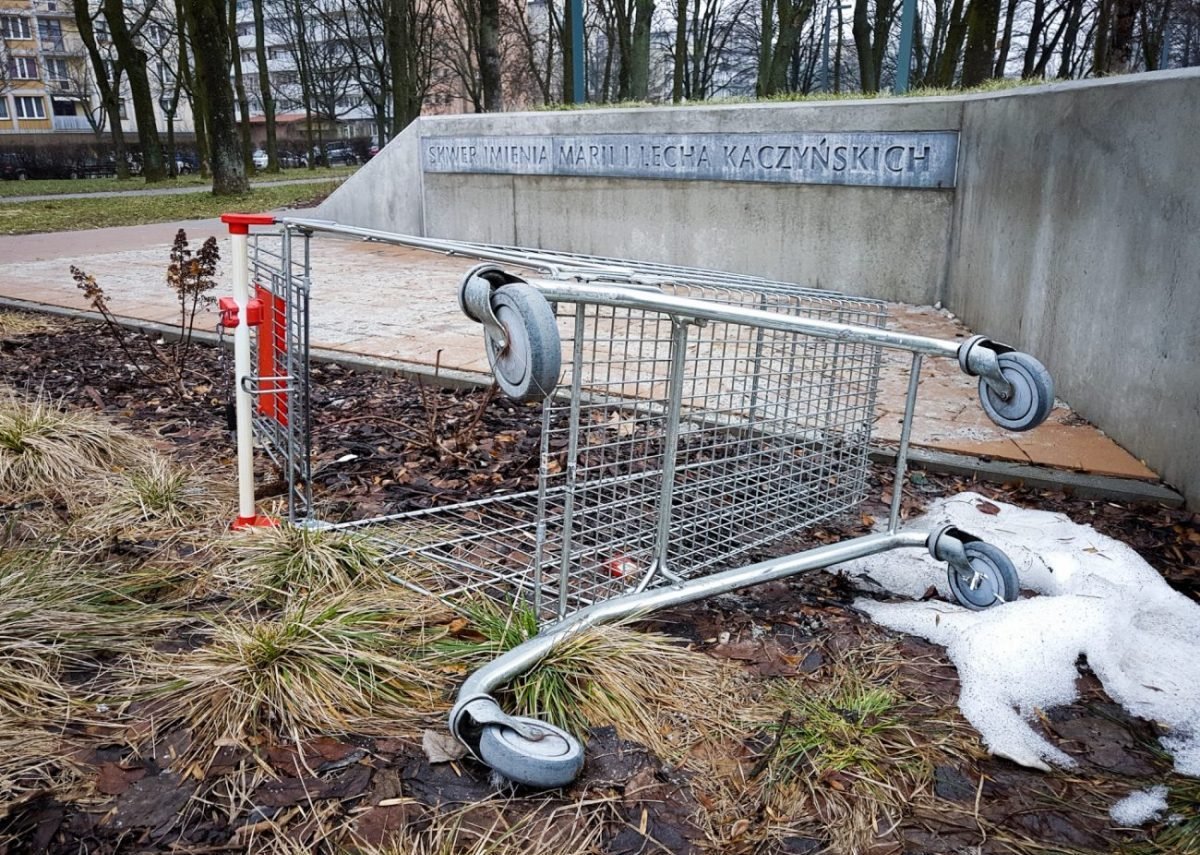 Skwer Marii i Lecha Kaczyńskich wygląda tragicznie. Dzisiaj (14.02) można było zobaczyć na skwerze wywrócony wózek z marketu, do tego wszędzie porozrzucane śmieci.