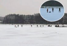 Ludzie spacerują i ślizgają się po zamarzniętym jeziorze Paprocany. „Przykład skrajnej nieodpowiedzialności”