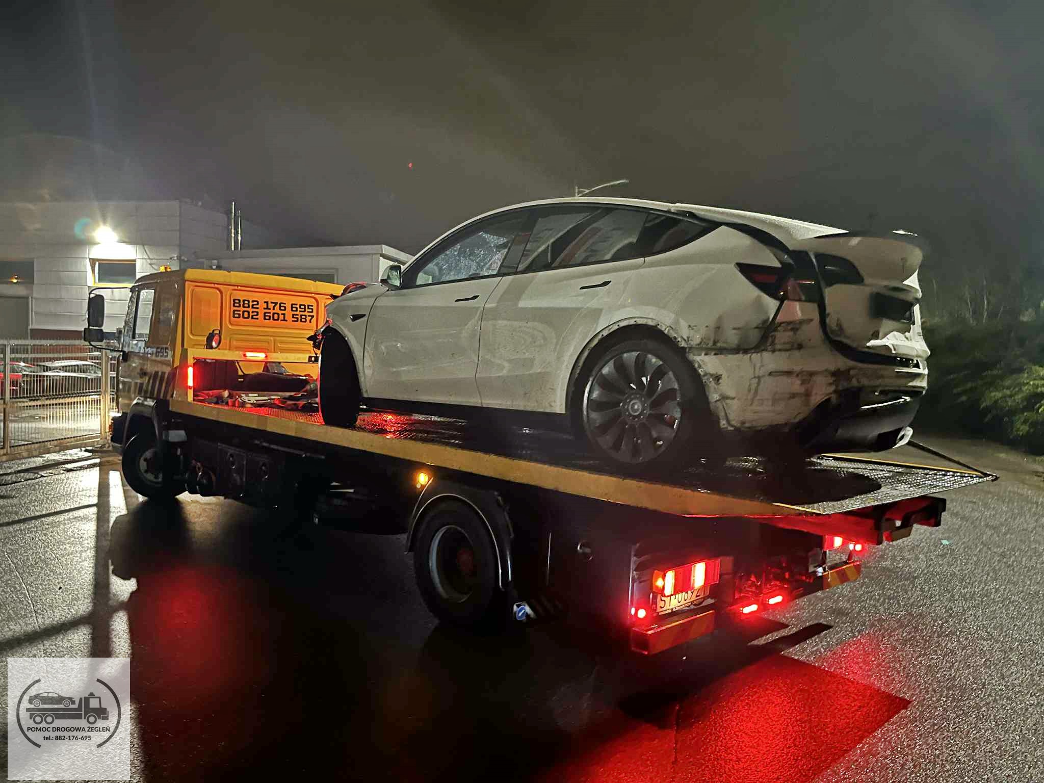Tychy: Tesla uderzyła w bariery energochłonne. Zdarzenie miało miejsce dzisiaj, kilka minut po północy, tuż przed skrzyżowaniem DK1 z ulicą Edukacji.