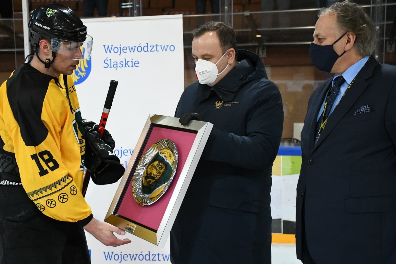 W trakcie spotkanie marszałek województwa śląskiego Jakub Chełstowski otrzymał z rąk prezesa PZHL Mirosława Minkiny Złotą Odznakę Polskiego Związku Hokeja na Lodzie za wsparcie polskiego hokeja w sezonie 2020/2021.