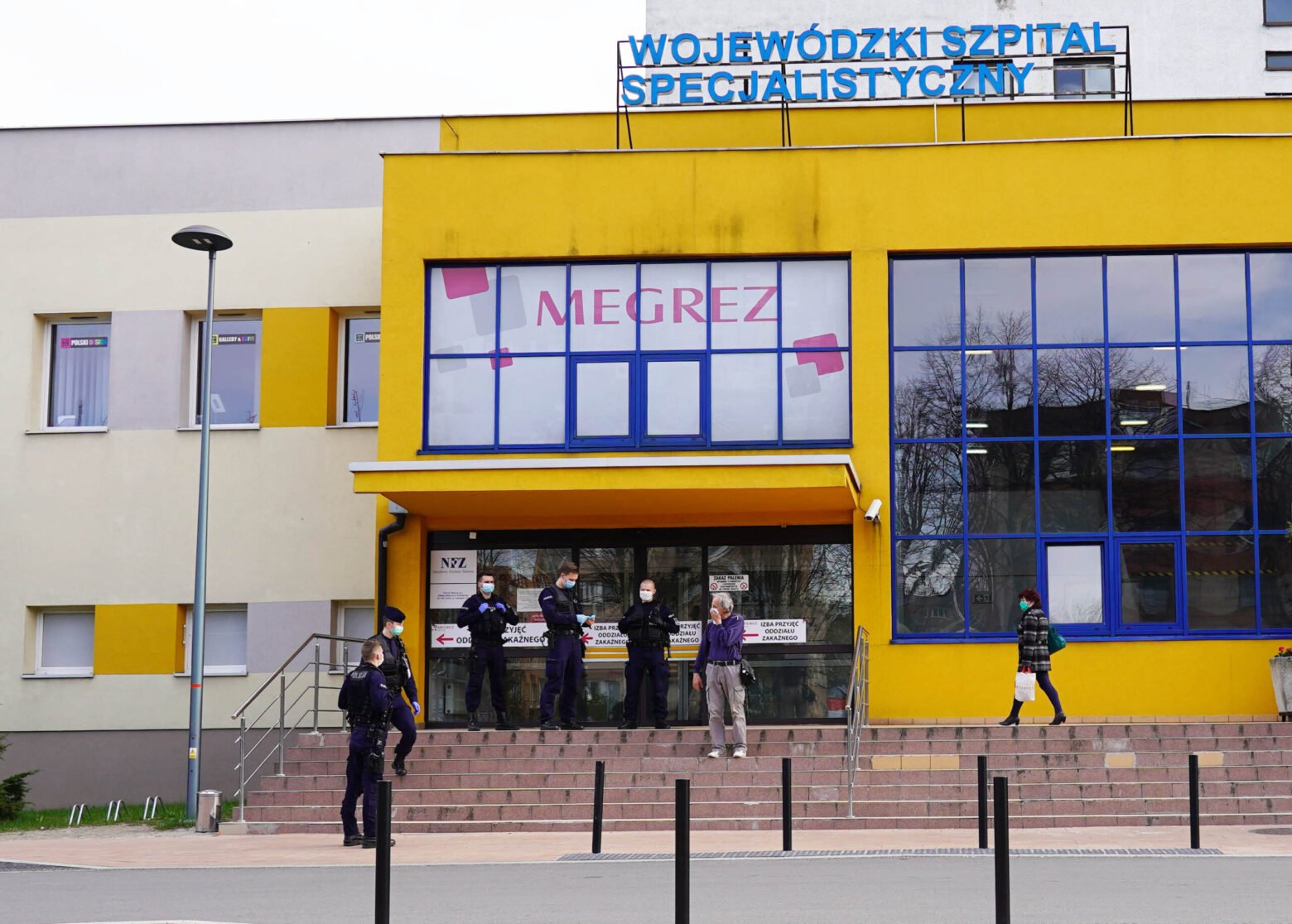 Wczoraj tj. w czwartek – czego świadkiem był nasz dziennikarz – po interwencji grupy policjantów ze Szpitala Megrez w Tychach wyszedł mężczyzna, który domagał się żeby ochroniarz chodził po całym obiekcie i sprawdzał gaśnice. Mężczyzna, gdy opuszczał szpital kawałkiem materiału zasłaniał twarz. Kilka minut później awanturował się przed pobliską Biedronką. W międzyczasie rozbierając się od pasa w górę. Ust i nosa nie zakrywał.