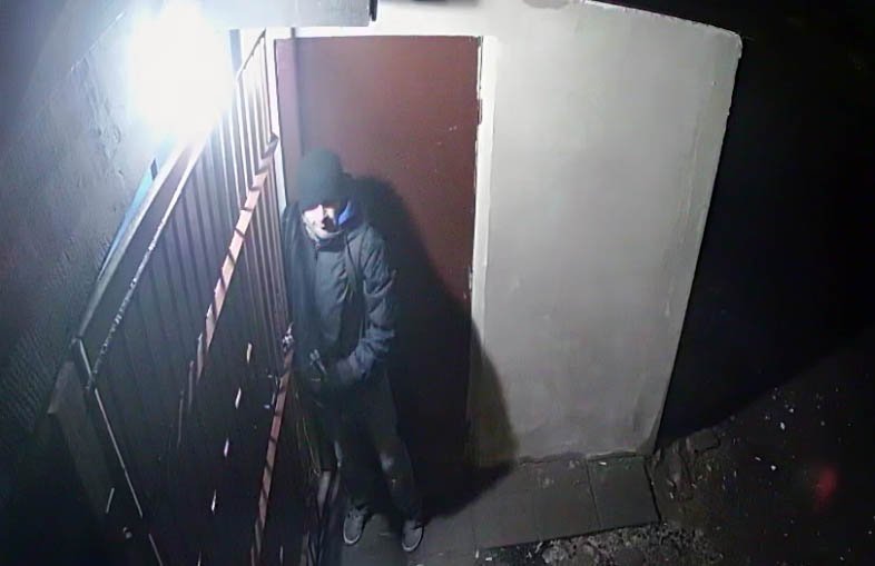 Rysopis: mężczyzna w wieku około 30lat, wzrostu około 176 cm, szczupłej budowy ciała, ubrany w czarną zimową czapkę, na twarzy miał chustę, która częściowo zakrywa jego usta i nos, czarną zimową kurtkę z kapturem, z której wystawał niebieski kaptur, prawdopodobnie bluzy, spodnie jeansowe koloru niebieskiego, szare buty.